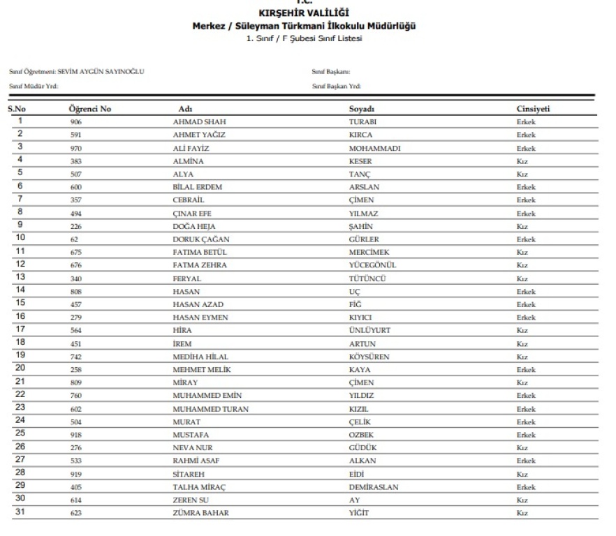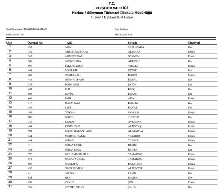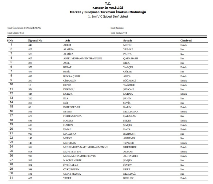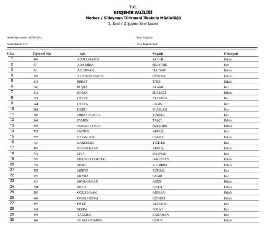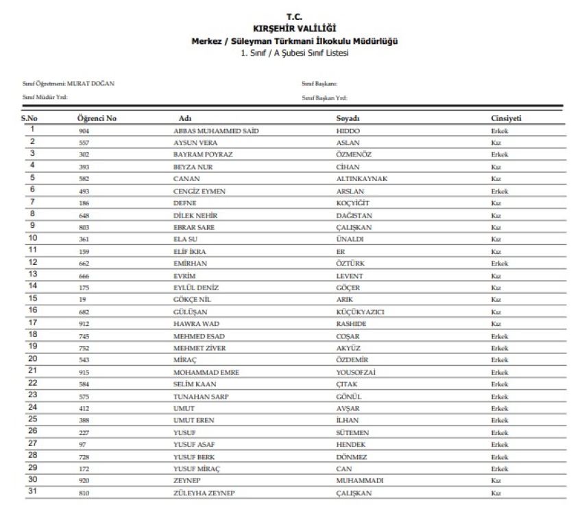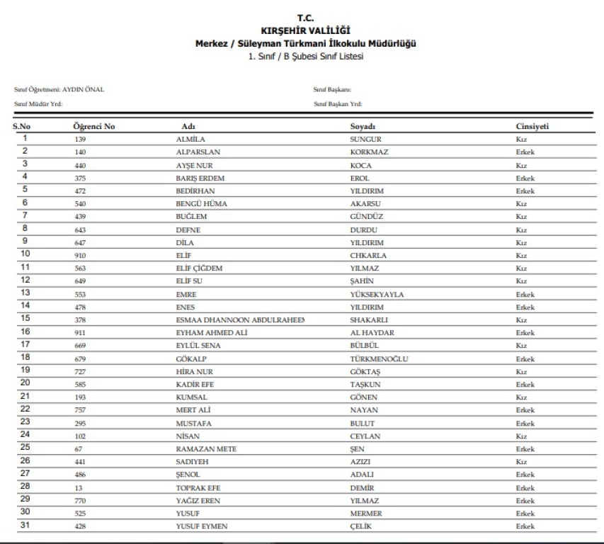 1. SINIF KURA SONUCU SINIF VE ÖĞRENCİ LİSTELERİ