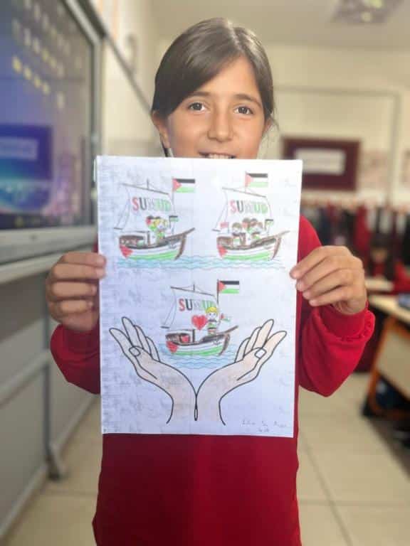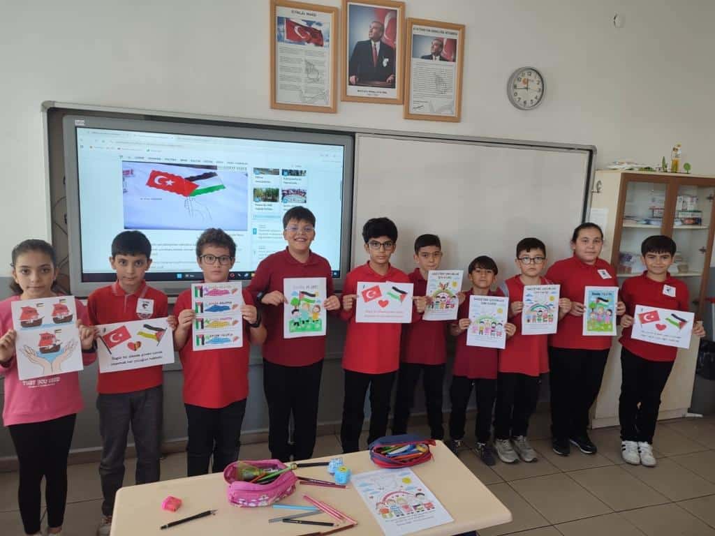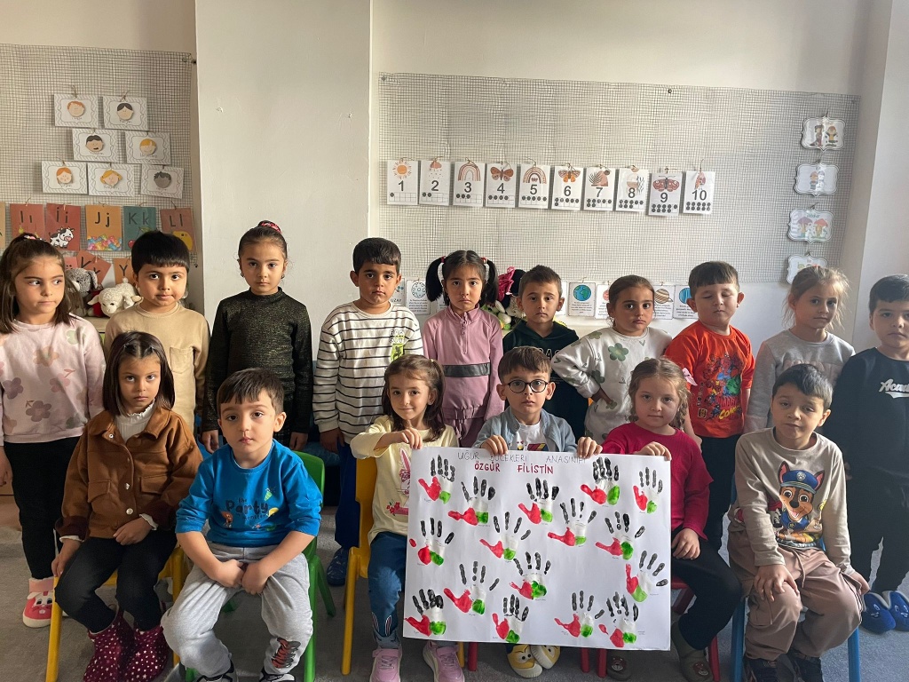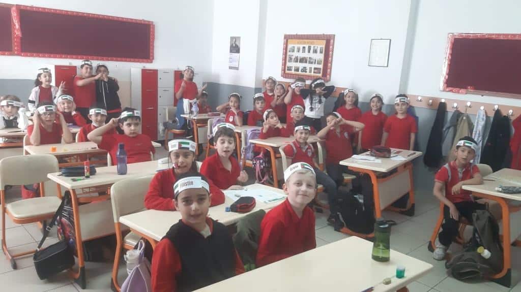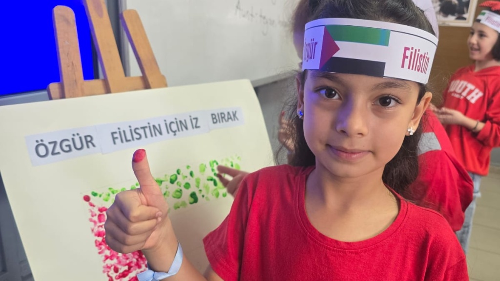 Bakanlığımızın ilgi yazılarında 7 Ekim Salı sabahı ülkemizdeki Tüm okullarda eş zamanlı olarak Türkiye yüzyılı Maarif modeli Erdem değer Eylem yaklaşımı esas alınarak gençlerimize Filistin'de yaşanan insan hakları ihlallerinin sona erdirilmesine yönelik olarak Filistin farkındalık etkinlikleri düzenleneceği bildirilmiştir Biz de Süleyman Türkmani İlkokulu olarak Filistin farkındalık etkinlikleri düzenledik öğrencilerimizin ve öğretmenlerimizin tam katılımıyla zalim İsrail zulmüne dur dedik.